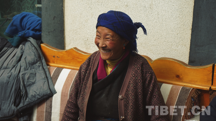 這是我最喜歡的莫啦。住在莫啦家的幾天里,除去采訪、收集素材和寫稿,最放松的時刻就是忙里偷閑和莫啦在廚房烤火、在巷子口曬太陽。莫啦會問我穿得這么少冷不冷,會給我講路過的小女孩有個雙胞胎姐姐,會讓我送熱水給我的同事喝,會拿盛滿卡塞和奶渣的點心盒塞給我吃,會在我想把手頭工作做完再吃飯時問同事我怎么不吃飯。當然這些我大多是聽不懂的,有些是德瓊阿佳(莫啦的女兒,拉康社區(qū)婦女主任,同時也是客棧的老板)和達次哥(這次出差的司機師傅)翻譯給我的,有些是我倆通過比劃猜到的。