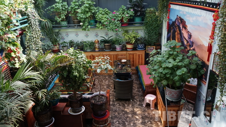 德瓊家庭旅館以女主人次仁德瓊的名字命名。工作人員告訴我們,這里是拉康鎮(zhèn)生意最好的旅館之一。旅館位于兩條主干道交接的拐角,地理位置好,招牌也立得醒目,每個(gè)進(jìn)入鎮(zhèn)子的人第一眼就能看到德瓊家庭旅館的招牌。但生意好絕不僅僅是因?yàn)榈乩砦恢脙?yōu)越。走進(jìn)這間旅館,如同進(jìn)入一間溫室花棚。在這里,花草植物是絕對的主角,各色草本、藤本、灌木植物高低錯落,幾乎填滿了墻壁空間。蕭瑟的冬日里,粉的、白的、紅的花朵擠擠挨挨地開著,茉莉、山茶、三角梅...來自不同地域的花卉植物在這邊境小鎮(zhèn)的一隅競相綻放,天南海北在此握手言和。德瓊阿佳用她對生活的熱情將家庭旅館裝點(diǎn)得生機(jī)盎然,我想正是這份純真的熱愛才是德瓊家庭旅館生意火爆的關(guān)鍵所在。