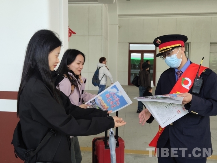圖為為助力林芝第二十一屆桃花旅游文化節(jié),方便廣大游客了解林芝、觀賞林芝獨具特色的旅游景點,林芝火車站為到站旅客介紹林芝各縣(區(qū)、市)獨具特色的景點、美食及賞花旅游攻略,同時為游客分發(fā)集合相關(guān)交通信息和氣象信息的《林芝報》。