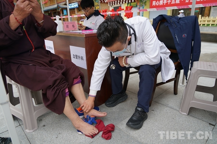 得知有來(lái)自北京的醫(yī)療專(zhuān)家為大家義診,家住白玉縣城的切呷一大早便帶著父母來(lái)到了義診現(xiàn)場(chǎng)。她的母親澤仁拉嘎今年75歲,自述下肢從腰間、腿部到腳尖都會(huì)發(fā)麻、有疼痛感,行走時(shí)腰部會(huì)很累,偶爾還會(huì)因?yàn)榭刂撇缓猛炔炕顒?dòng)而摔倒。北京水利醫(yī)院創(chuàng)傷骨科副主任醫(yī)師王耀輝在經(jīng)過(guò)詳細(xì)問(wèn)診后,為拉嘎阿媽開(kāi)具了營(yíng)養(yǎng)神經(jīng)的藥品,并建議她進(jìn)一步做胸椎和腰椎方面的檢查。