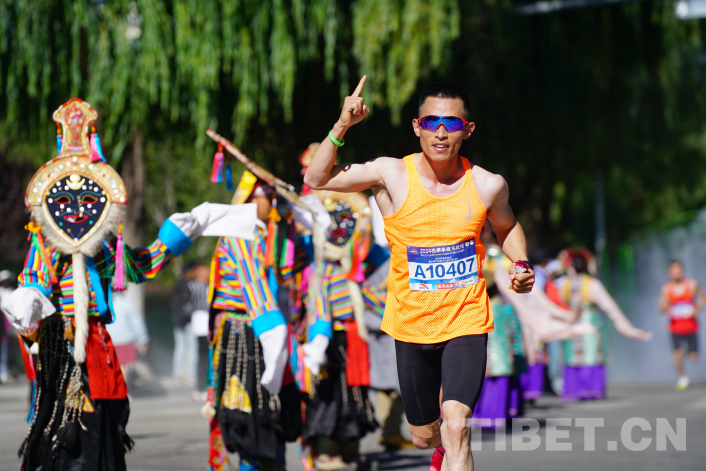 圖為 2024拉薩半程馬拉松18公里處參賽選手途經(jīng)拉魯濕地國家級自然保護區(qū),拉薩市城關(guān)區(qū)藏戲藝術(shù)團以藏戲的形式為選手加油助威 攝影:趙振宇