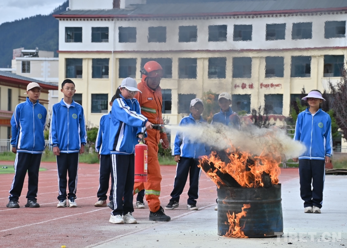 圖為學(xué)生體驗(yàn)滅火器使用方法 攝影:西繞拉翁