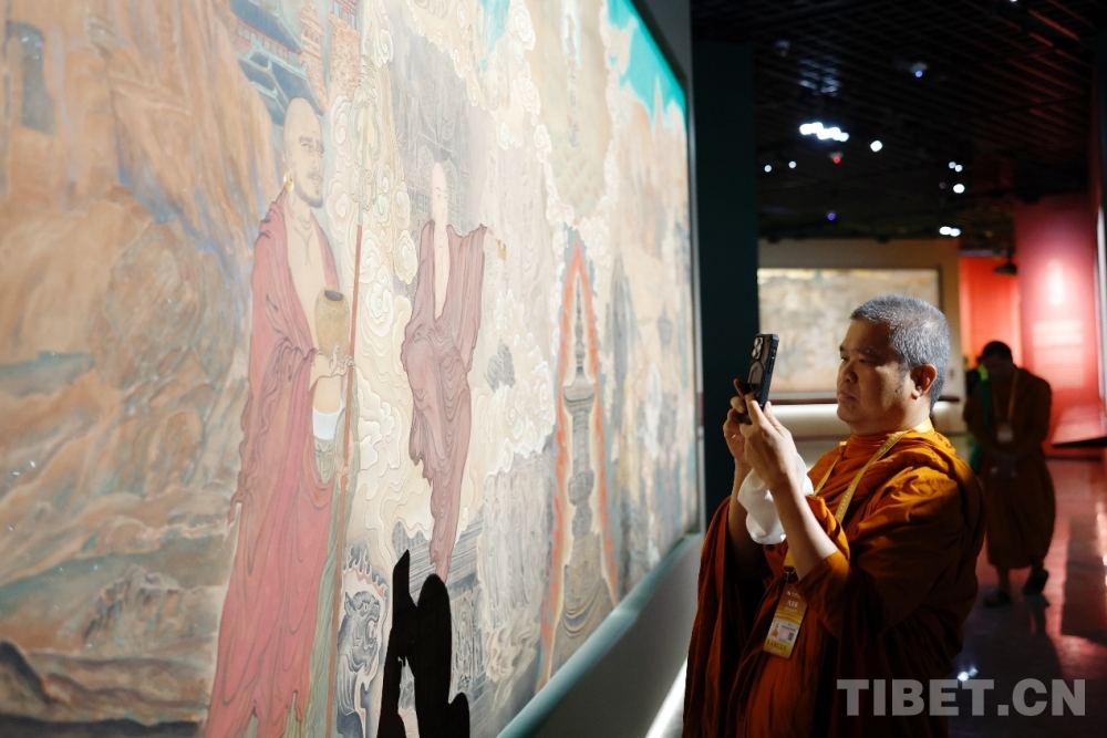 圖為與會(huì)者參觀“同愿同行——中國佛教傳承發(fā)展主題創(chuàng)作展”