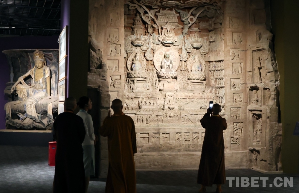 圖為與會(huì)者在“翰墨佛緣——‘中國歷代繪畫大系’佛教藝術(shù)珍品展”上參觀大足石刻北山佛灣第245龕觀無量壽佛經(jīng)變相龕(3D打印復(fù)制)