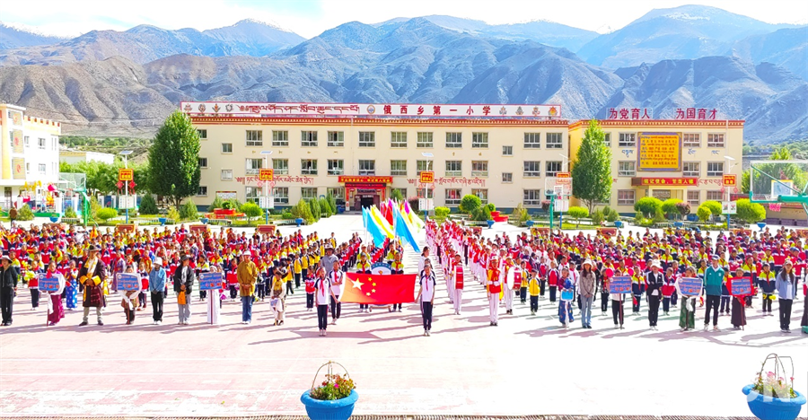 圖為西藏自治區(qū)昌都市洛隆縣俄西鄉(xiāng)第一小學(xué)開展升旗儀式等活動(dòng)