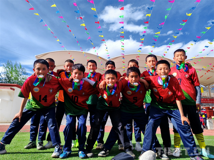 圖為洛隆縣俄西鄉(xiāng)第一小學(xué)的學(xué)生們?cè)谧闱驁?chǎng)上開心合影
