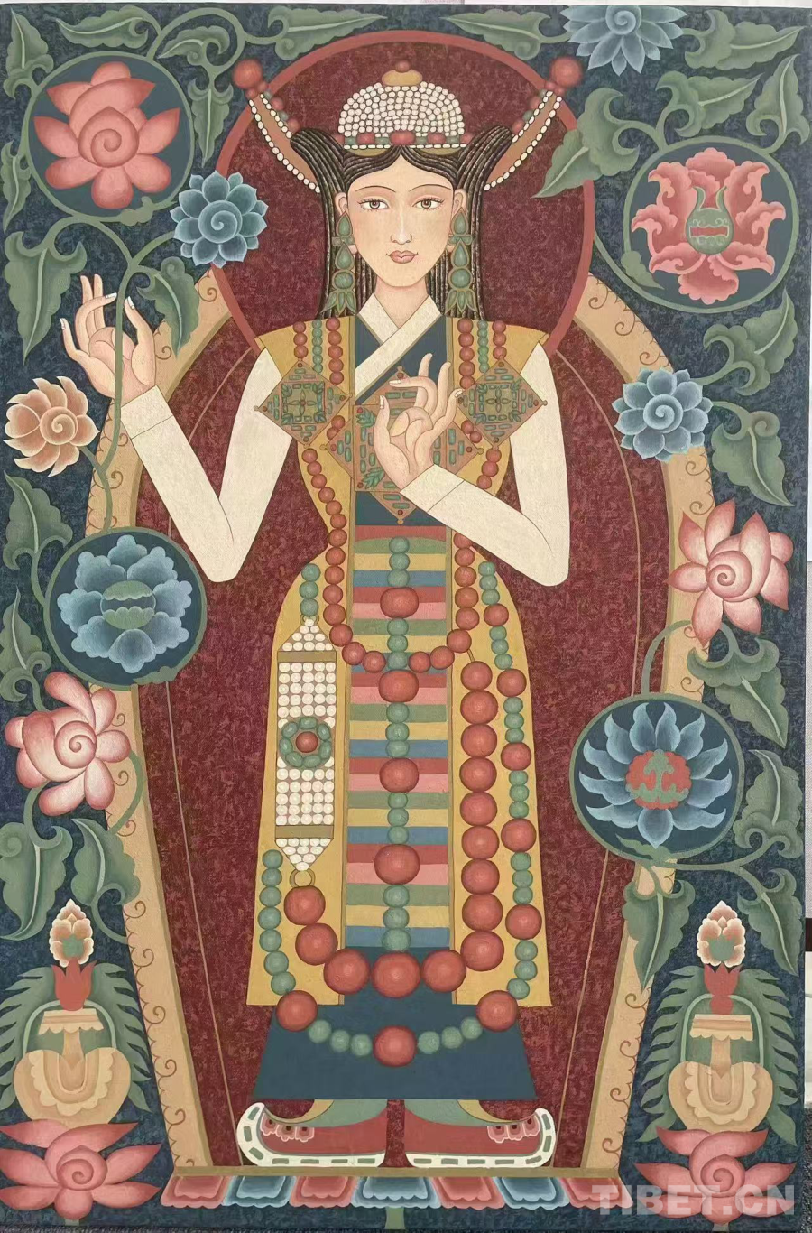 本屆西藏精品唐卡展以“傳承·創(chuàng)新·和諧”為主題,共展出60幅唐卡作品和20幅當(dāng)代布面重彩作品,作品創(chuàng)作題材廣泛、風(fēng)格流派多樣,藝術(shù)樣式豐富,不僅展現(xiàn)了傳統(tǒng)唐卡的精湛技藝,也融入了現(xiàn)代元素,展現(xiàn)了藝術(shù)家們對(duì)傳統(tǒng)與現(xiàn)代的深刻理解和獨(dú)特見解。這種多樣化、多元化的藝術(shù)展示,不僅使作品具有了更為豐富的表現(xiàn)力和視覺沖擊力,同時(shí)也為西藏當(dāng)代唐卡藝術(shù)創(chuàng)作注入了新的活力,為西藏當(dāng)代唐卡藝術(shù)多元發(fā)展奠定了良好的基礎(chǔ)。