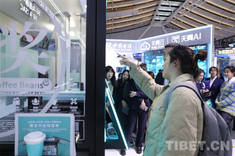 圖為游客排隊購買機(jī)器人咖啡,咖啡有幾十種選擇,幾十秒就可以制作完畢,在現(xiàn)場異?;鸨?攝影:王妍丹