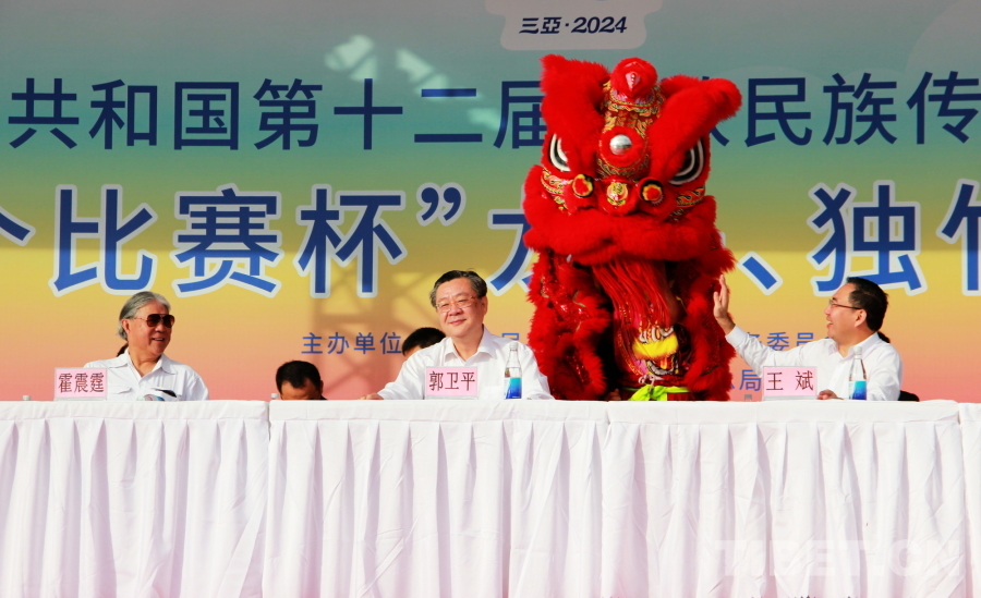 圖為第十二屆全國(guó)少數(shù)民族傳統(tǒng)體育運(yùn)動(dòng)會(huì)龍舟項(xiàng)目開(kāi)賽前,舞獅與嘉賓互動(dòng) 攝影:劉莉