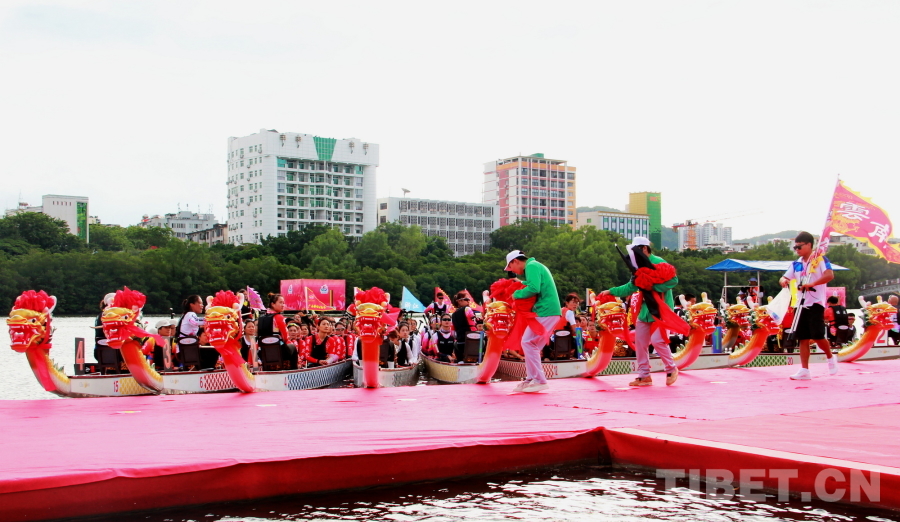賽前,在龍舟巡游活動(dòng)后,國(guó)家民委副主任郭衛(wèi)平,海南省委常委、宣傳部部長(zhǎng)王斌,香港代表團(tuán)顧問(wèn)、中國(guó)香港體育協(xié)會(huì)暨奧林匹克委員會(huì)會(huì)長(zhǎng)霍震霆,香港代表團(tuán)團(tuán)長(zhǎng),香港文化體育及旅游局體育專員蔡健斌,國(guó)家民委文化宣傳司司長(zhǎng)張謀,國(guó)家民委港澳臺(tái)辦公室主任魏國(guó)雄,海南省政府副秘書長(zhǎng)國(guó)章成,國(guó)家民委文化宣傳司副司長(zhǎng)張劍輝,國(guó)家民委港澳臺(tái)辦公室副主任趙靜,海南省民委副主任黎梁東,海南省旅文廳副廳長(zhǎng)王忠云,海南省三亞市政府副市長(zhǎng)張長(zhǎng)豐為龍舟點(diǎn)睛、披紅,將比賽氛圍烘托得格外喜慶熱烈。