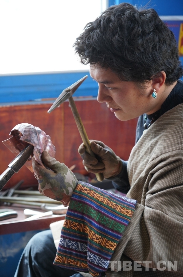 叮叮叮,叮叮?!し欢?,傳來一陣陣金屬敲擊的聲響。掀開門簾,一個(gè)小伙子坐在窗邊,右手拿錘,左手握著佛像架在細(xì)長的鐵器上,右手的錘子不停地敲擊著,左手也在一邊輕微轉(zhuǎn)動(dòng),目光緊緊鎖在眼前的佛像上柔和而堅(jiān)定,古銅色的面龐與紅銅佛像仿佛在進(jìn)行無聲的“對話”。