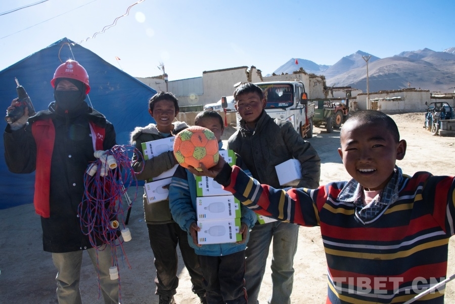 “來(lái),你們拿著這些燈泡跟著我!”在次仁旦增和其他兩位組員的組織下,小男孩們化身為措昂村受災(zāi)安置點(diǎn)的小小志愿者,簇?fù)碇鴱倪@些從山南前來(lái)支援的國(guó)家電網(wǎng)工作人員走進(jìn)一間間帳篷,為站在高處正在架設(shè)電線的叔叔們遞上工具和燈泡。