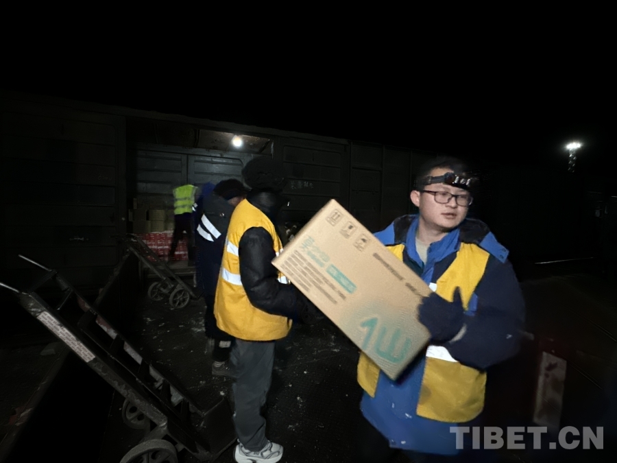圖為首趟抗震救災(zāi)物資專列抵達日喀則,工作人員爭分奪秒進行物資搶卸轉(zhuǎn)運 攝影:周悅翔 馬生明