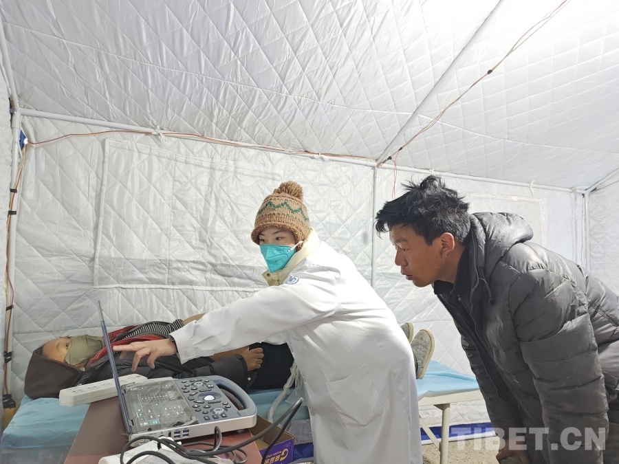 圖為定日縣曲洛鄉(xiāng)仁果村阜康醫(yī)院臨時(shí)醫(yī)療點(diǎn)蹲點(diǎn)醫(yī)生全雄杰正在為小男孩看病