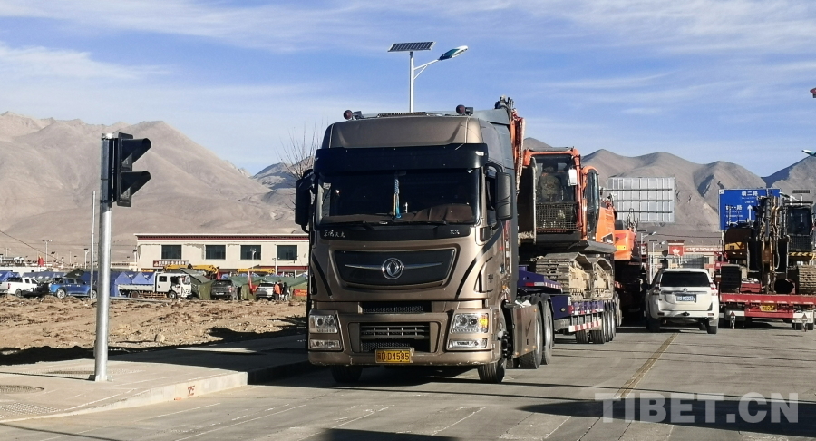 圖為卡車將大量挖掘機等工程機械運往西藏自治區(qū)日喀則市定日縣 攝影:劉莉