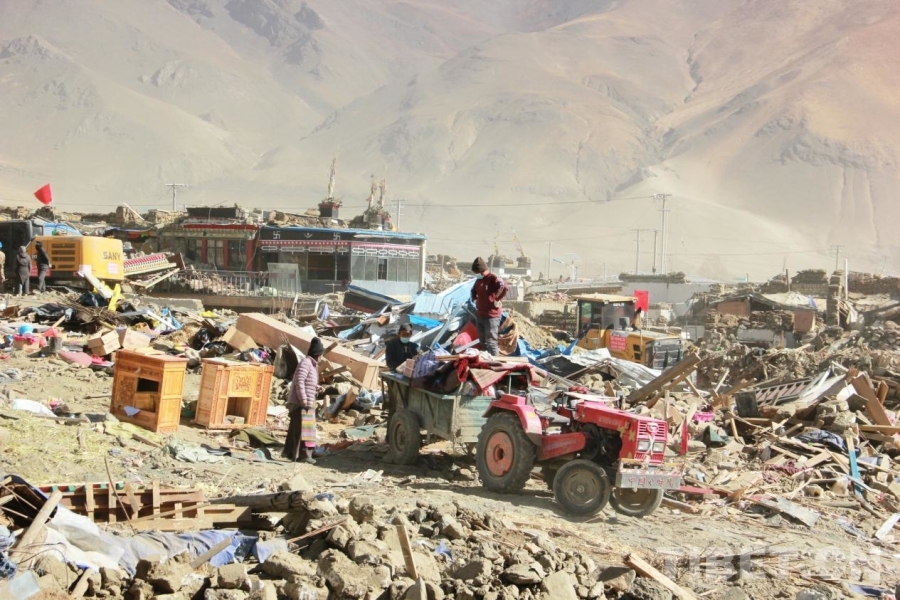 圖為地震重災(zāi)區(qū)西藏自治區(qū)日喀則市定日縣長所鄉(xiāng)除險現(xiàn)場,村民在已完成除險的地方搜集尚可再次利用的物資,旁邊未受到嚴(yán)重?fù)p壞的房屋被保留下來 攝影:劉莉