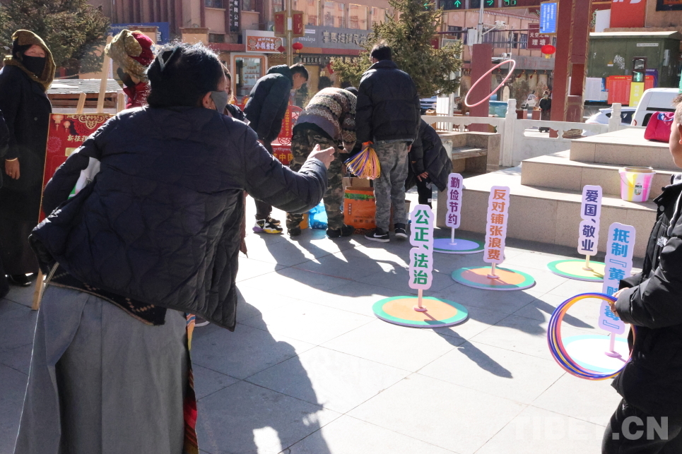 在新時(shí)代文明實(shí)踐集市,以互動(dòng)游戲?yàn)橹?,分設(shè)了“文明新風(fēng)”主題套圈游戲和“文明舉止”紅黑榜分類游戲、“垃圾分類”沙包投放游戲、文明家風(fēng)親子拼圖等項(xiàng)目,每個(gè)區(qū)域前都擠滿了游玩體驗(yàn)的人群?!斑@個(gè)套圈游戲很受歡迎,我們把‘愛國敬業(yè)’‘反對(duì)鋪張浪費(fèi)’等社會(huì)主義核心價(jià)值觀有關(guān)內(nèi)容制作成套圈道具,讓大家在趣味活動(dòng)中了解文明理念。”理塘縣委宣傳部工作人員介紹道。