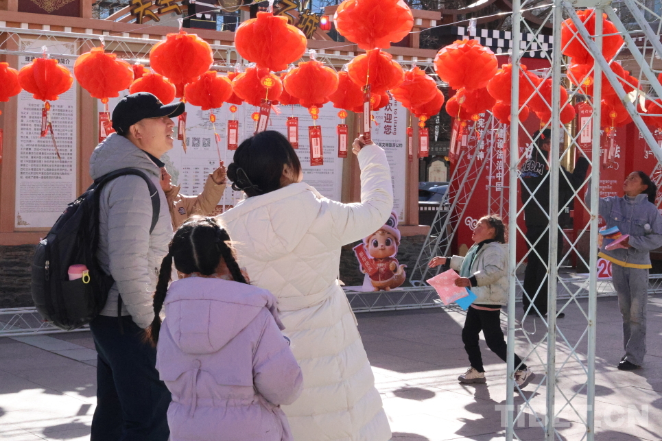 燈謎競(jìng)猜區(qū)格外受歡迎,上百盞紅紅火火的燈籠上掛著福字和各色謎面,男女老少眾多猜謎者穿梭其間,不亦樂乎。