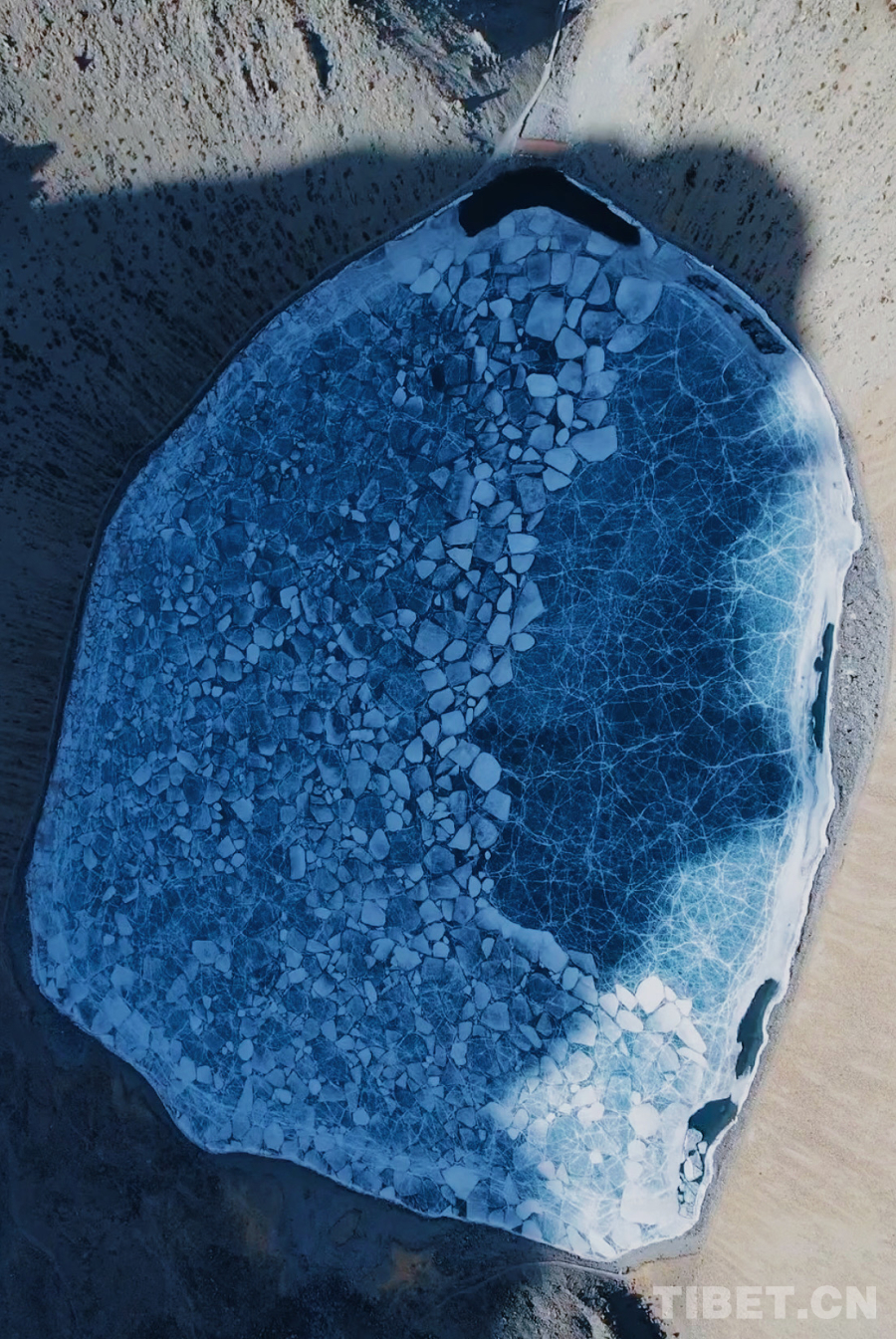 圖為冬日的恰央錯(cuò)湖面結(jié)冰,湛藍(lán)如翡翠,從空中俯瞰如同一個(gè)巨大的“盾牌”,十分壯觀,前來(lái)打卡的游客更是絡(luò)繹不絕。攝影:德吉卓瑪