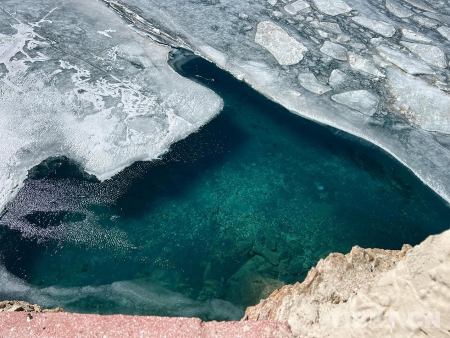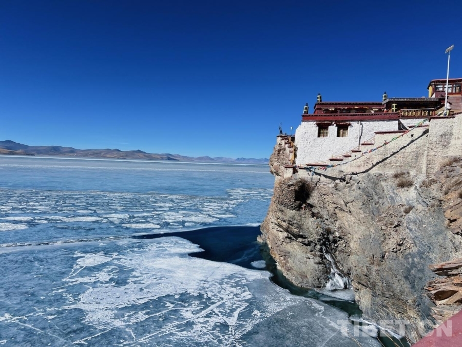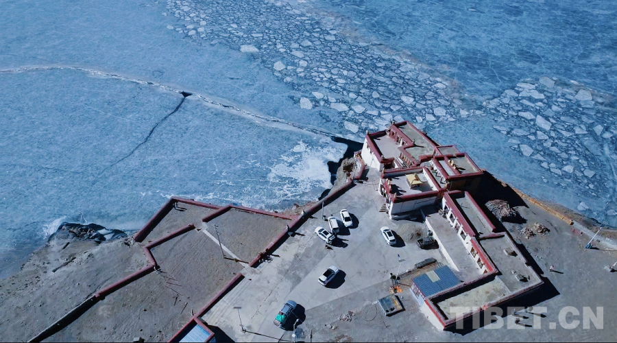 圖為普莫雍錯(cuò)一角化冰,湖面清澈見(jiàn)底,如同一塊翡翠掉落在推瓦寺一旁,美麗動(dòng)人。攝影:德吉卓瑪