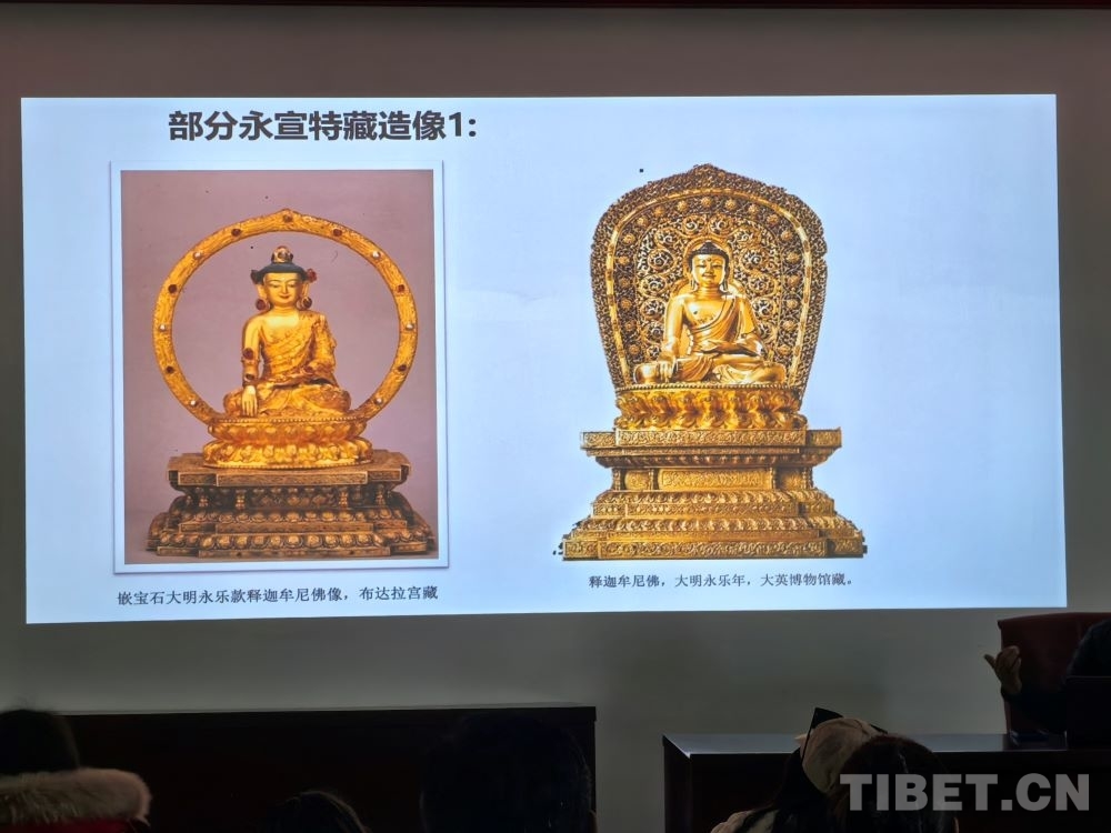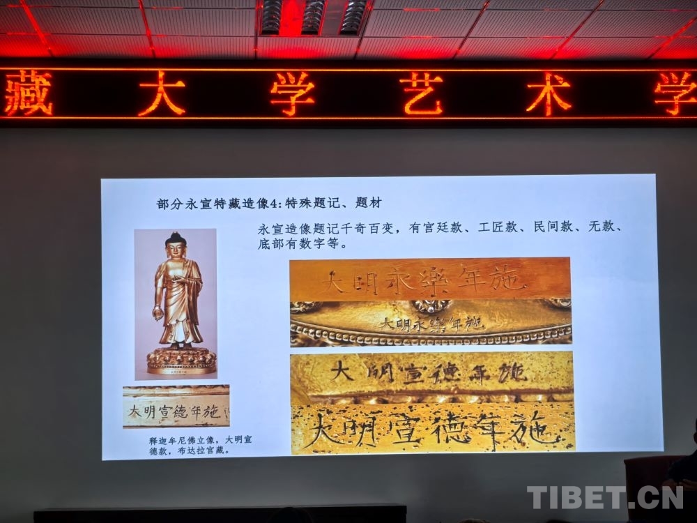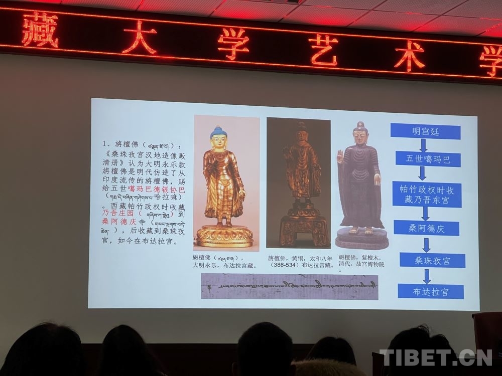 5月8日,在西藏大學藝術學院內(nèi),一場題為《布達拉宮館藏大明永宣款造像相關問題考察——兼談“漢地造像殿”的復原陳設研究》的講座吸引了眾多學術愛好者。布達拉宮文物管理處文物研究室班旦次仁老師以大量西藏大明永宣款造像為案例,向在場聽眾介紹了這一時期的佛像如何以媒介的形式增強各民族間的感情。
