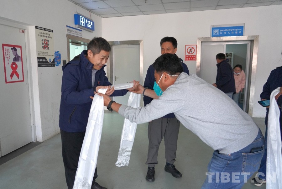 圖為患者家屬正在為兩名醫(yī)生敬獻哈達