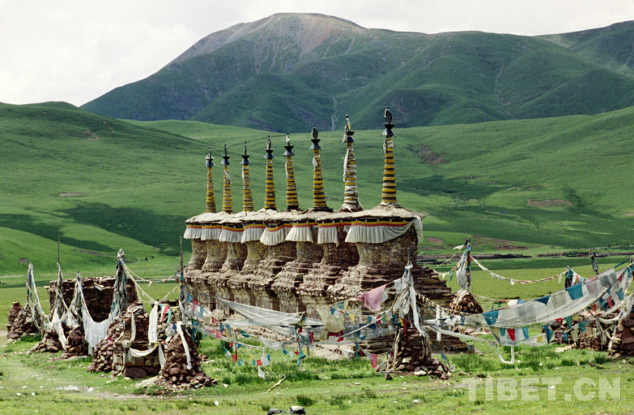 圖為當(dāng)雄至那曲不遠(yuǎn)處,公路邊所立的八座白塔(唐召明1998年攝)