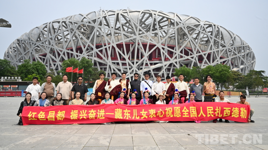 圖為西藏自治區(qū)昌都市洛隆縣文藝代表團在鳥巢前合影