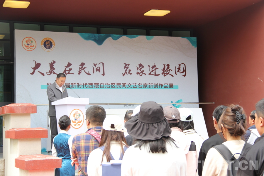 6月20日,“大美在民間——名家進(jìn)校園暨第三屆新時(shí)代西藏自治區(qū)民間文藝名家新創(chuàng)作品展”開展。圖為西藏大學(xué)黨委常委、副校長王斌禮致辭 攝影:趙釗