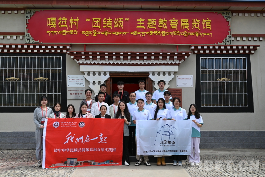 圖為西藏民族大學(xué)實踐團(tuán)在嘎拉村“團(tuán)結(jié)頌”主題教育展覽館前的合影
