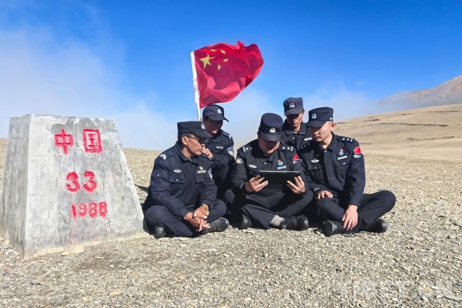 圖為日喀則邊境管理支隊(duì)昌果邊境派出所民警在33號(hào)界樁處開展邊境巡邏間隙圍坐一起,觀看西藏自治區(qū)成立60周年慶祝大會(huì)直播盛況 攝影:盧恒