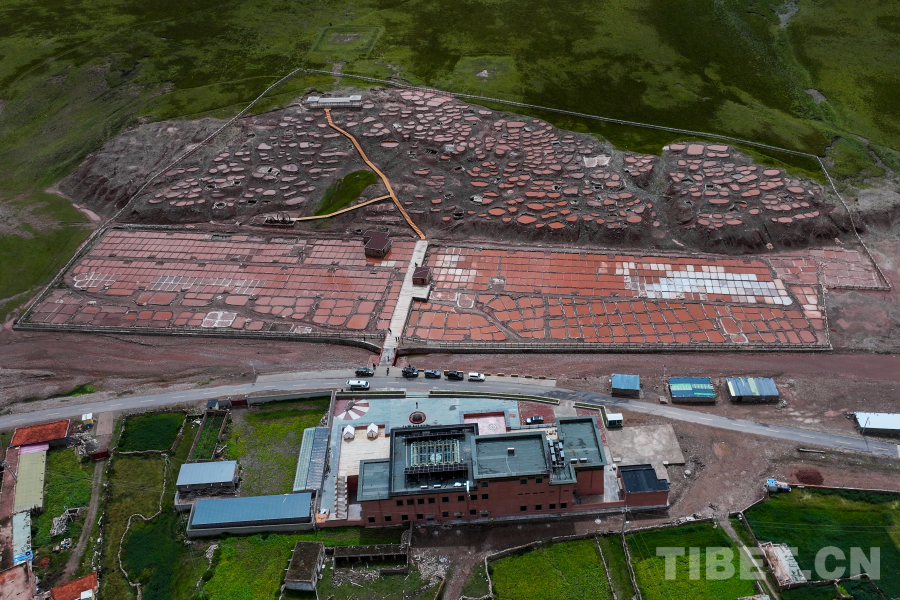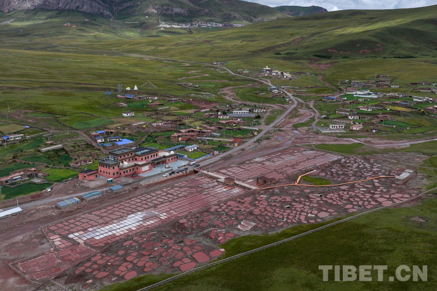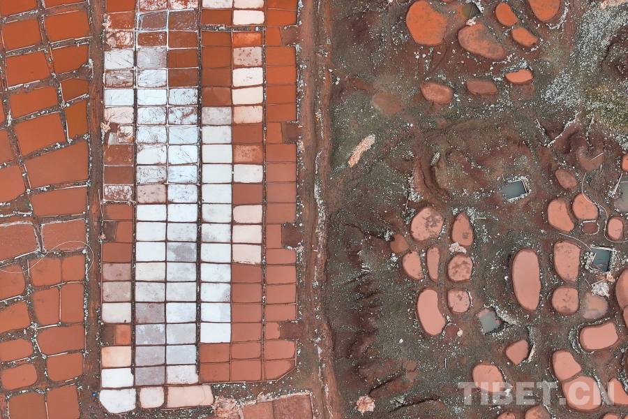 圖為航拍白扎鹽場(chǎng),這種紅褐色的顏色來(lái)自附近山體中所含的礦物質(zhì) 攝影:薛蒂