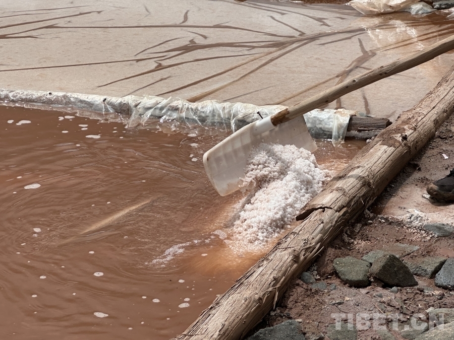 白扎鹽場(chǎng)出產(chǎn)的鹽有白鹽與紅鹽兩種,圖為江羊巴桑正在向我們展示白鹽的制取過(guò)程??梢钥吹剑M管鹵水呈現(xiàn)較深的紅褐色,但初步制取的鹽仍然呈現(xiàn)雪白的顏色。攝影:畢然
