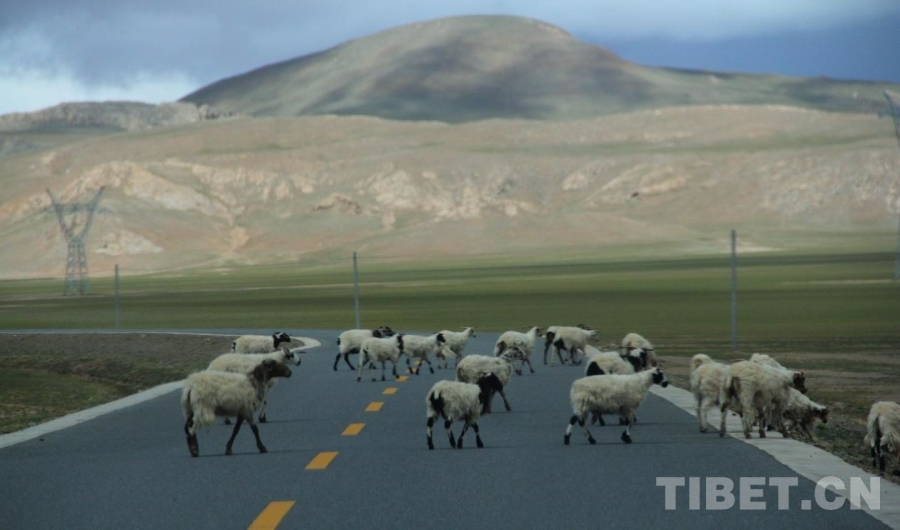 圖為從班戈到雙湖的路兩邊有大片草場(chǎng),牛羊在悠閑吃草 攝影:趙釗