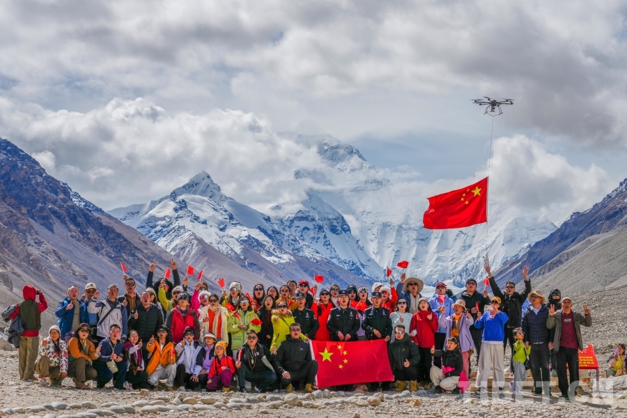 中國西藏網(wǎng)訊 國慶前夕,西藏日喀則邊境管理支隊(duì)珠峰邊境派出所民警在珠峰大本營(yíng)和游客舉行了一場(chǎng)特殊的升旗儀式:一架無人機(jī)擎旗騰空,現(xiàn)場(chǎng)民警和群眾齊唱國歌,五星紅旗在雪域之巔迎風(fēng)飄揚(yáng)。(中國西藏網(wǎng) 通訊員/葉軼 記者/趙振宇)