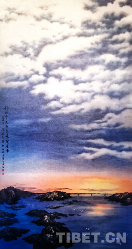 “這些云是用留白的方式留出來的。在西藏戍邊30多年,最難忘的就是西藏的藍天白云,變化萬千,特別的美?!蓖醪亟⑿χ嗽斶@些飽含他情感的畫作,思緒又飄向了令他魂牽夢繞的高原……