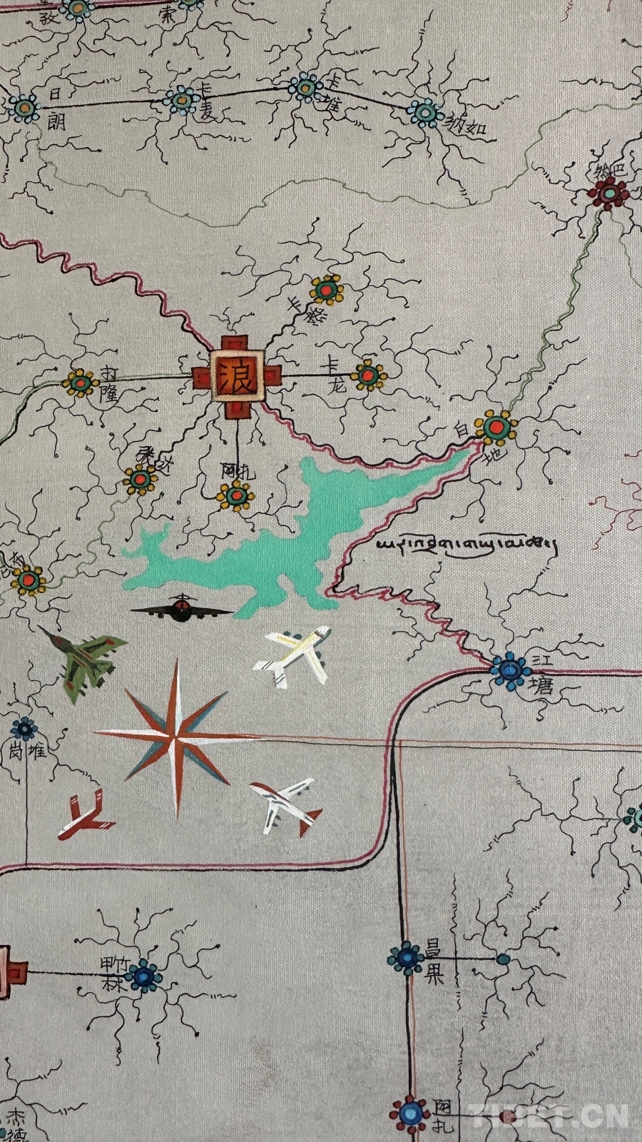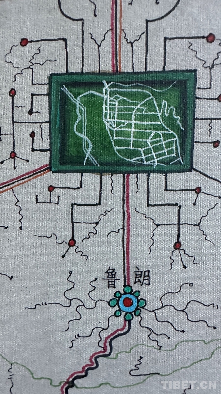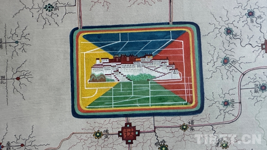 作為一件與地圖密切相關(guān)的作品,達(dá)布主要依據(jù)公路主線和國(guó)家公布的行政區(qū)域進(jìn)行描繪,對(duì)于一些在常用地圖上無(wú)法精確定位的地名,采取了審慎態(tài)度。達(dá)布還追溯了西藏的地圖繪制傳統(tǒng),認(rèn)為可以從著名的《西藏鎮(zhèn)魔圖》開(kāi)始算起。然而,創(chuàng)作中的挑戰(zhàn)并沒(méi)有阻礙他的創(chuàng)作熱情?!爱嬛@幅畫,我覺(jué)得這是一個(gè)普通唐卡畫師用畫筆感恩當(dāng)下,是對(duì)歷史的真實(shí)記錄,對(duì)偉大工程成果的贊揚(yáng),也是對(duì)傳統(tǒng)唐卡表現(xiàn)形式的突破和思考?!?nbsp;