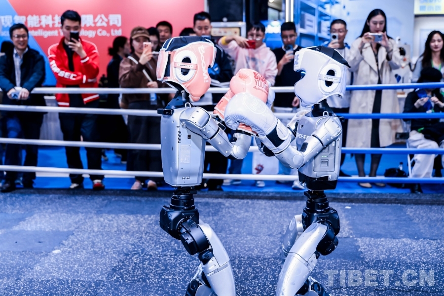 圖為兩位機(jī)器人拳手交替進(jìn)攻,在靈活的站立攻防轉(zhuǎn)換中彰顯了最新的人工智能成果。