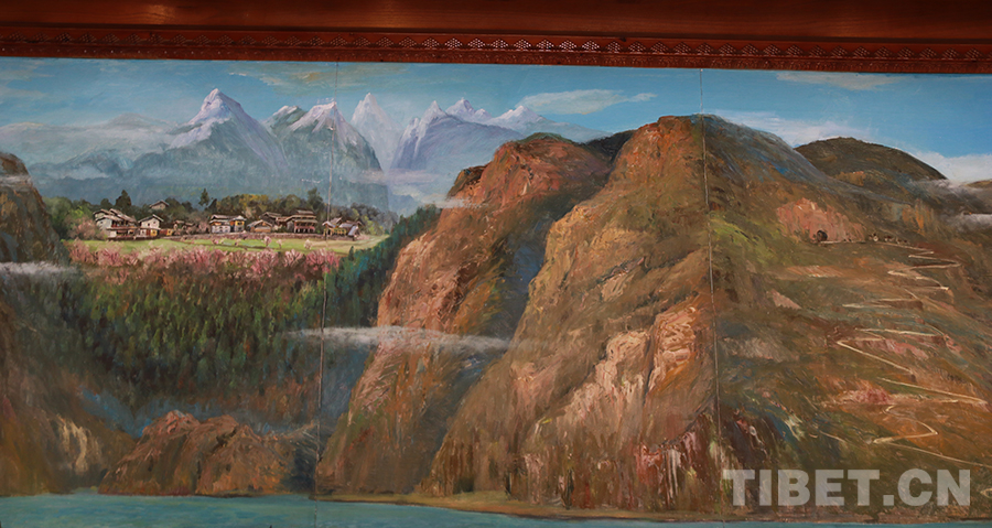 圖為色龍村內(nèi)建筑上的壁畫(huà),生動(dòng)描繪了色龍村所處的特殊地理?xiàng)l件,右邊的盤(pán)山公路蜿蜒通過(guò)隧道之后而有左邊的“桃花源” 攝影:王妍丹