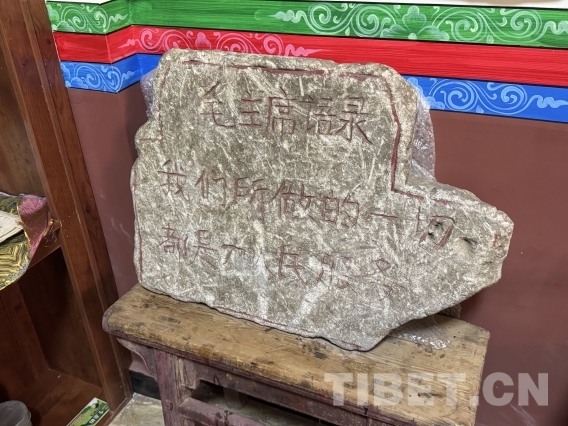 如今,松安寺內(nèi)有一座專門設(shè)立的紅色文物陳列室,長(zhǎng)青介紹道,這座紅色文物陳列室是現(xiàn)任活佛羅讓甲央在當(dāng)?shù)卣С窒禄I建而成。陳列室廣泛收集了有關(guān)紅色文物進(jìn)行集中展示,供僧眾和信教群眾參觀學(xué)習(xí)。有一塊石刻被視為“鎮(zhèn)館之寶”,上面刻著毛主席的語錄“我們所做的一切都是為人民服務(wù)”。石刻是寺廟在維修僧房時(shí)從房基下發(fā)現(xiàn)而挖出的,年代久遠(yuǎn),也見證了歷史里精神的傳承。