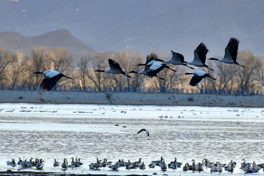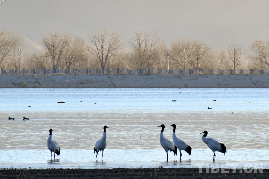 圖為拉薩市林周縣卡孜水庫(kù)內(nèi)越冬的黑頸鶴(攝于11月23日)攝影:趙振宇