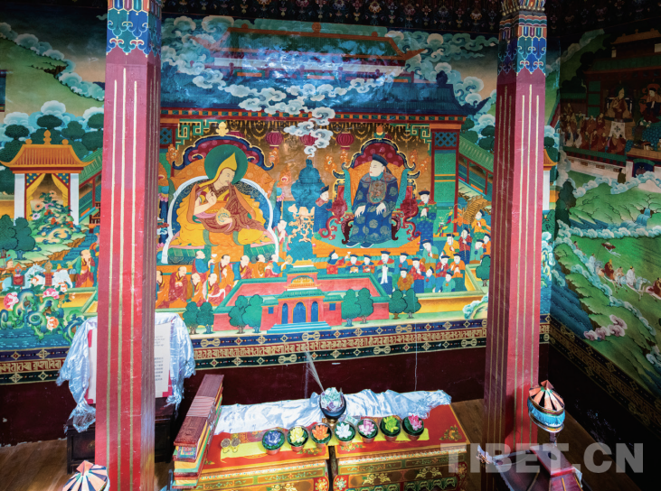 圖為五世達(dá)賴?yán)锕示觾?nèi)的壁畫(huà)——清順治皇帝接見(jiàn)五世達(dá)賴?yán)?/p>