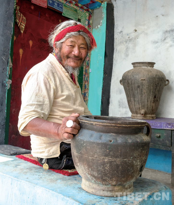 圖為制陶者次仁古桑老人及其得意之作