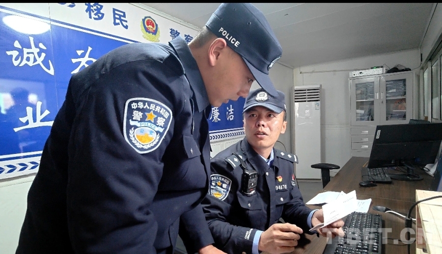 圖為王啟明將檢查完畢的證件遞還給游客,劉建宏在一旁學習