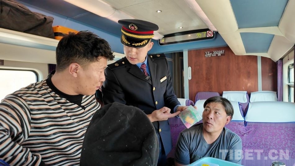 圖為乘務(wù)員用漢語、藏語、英語播報(bào)乘車注意事項(xiàng) 攝影:陳衛(wèi)國