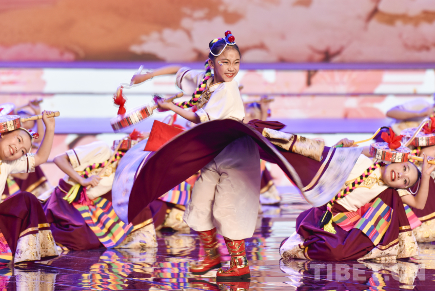 圖為2026拉薩藏晚節(jié)目少兒舞蹈《鼓舞新時(shí)代》丹增珍美(中)與小伙伴一起為大家?guī)砭薀岚臀琛z影:趙振宇