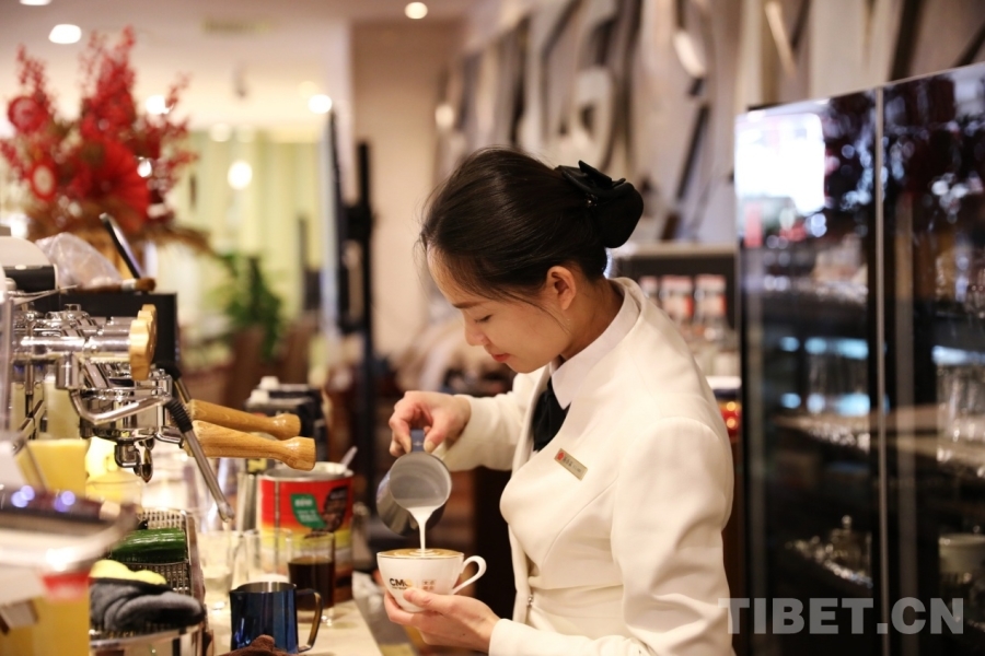 2026年全國兩會新聞中心茶歇處飲品吧工作人員正在為咖啡拉花 攝影:劉莉