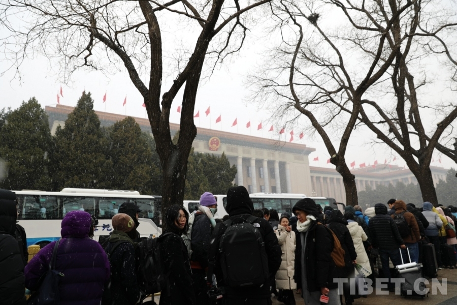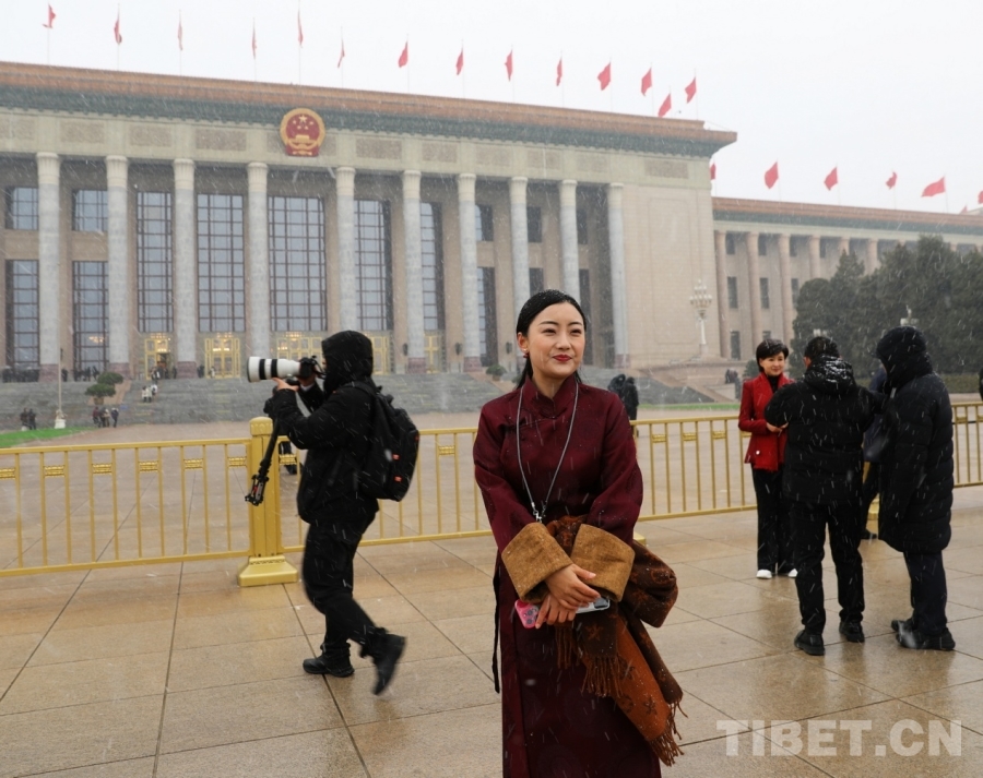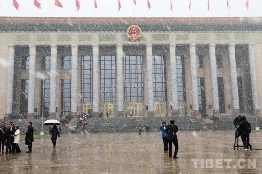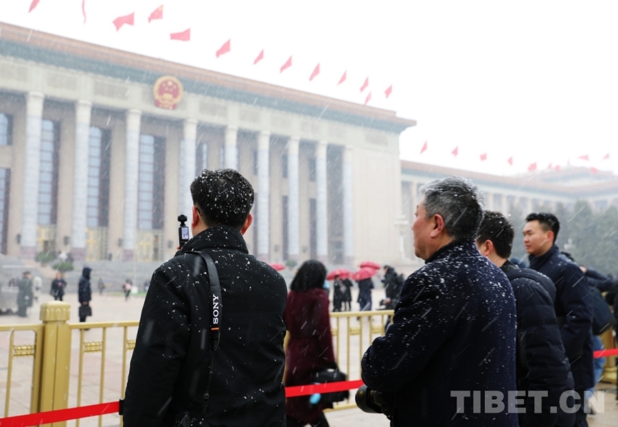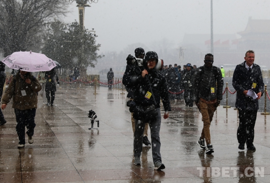 3月4日上午,十四屆全國人大四次會議舉行預(yù)備會議。會議結(jié)束后,一場春雪不期而至。在紛揚(yáng)的大雪中,康巴衛(wèi)視記者正在工作。攝影:劉莉