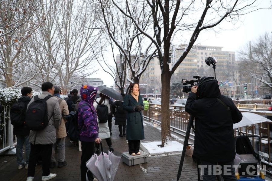 3月5日清晨,記者們在人民大會(huì)堂外播報(bào)新聞。