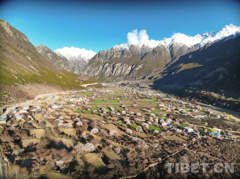航拍視角下的尼屋春日,野桃林如粉霞般點(diǎn)綴在河谷村落,勾勒出“藏北江南”詩(shī)意畫卷。
